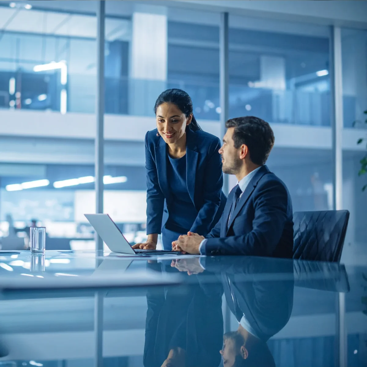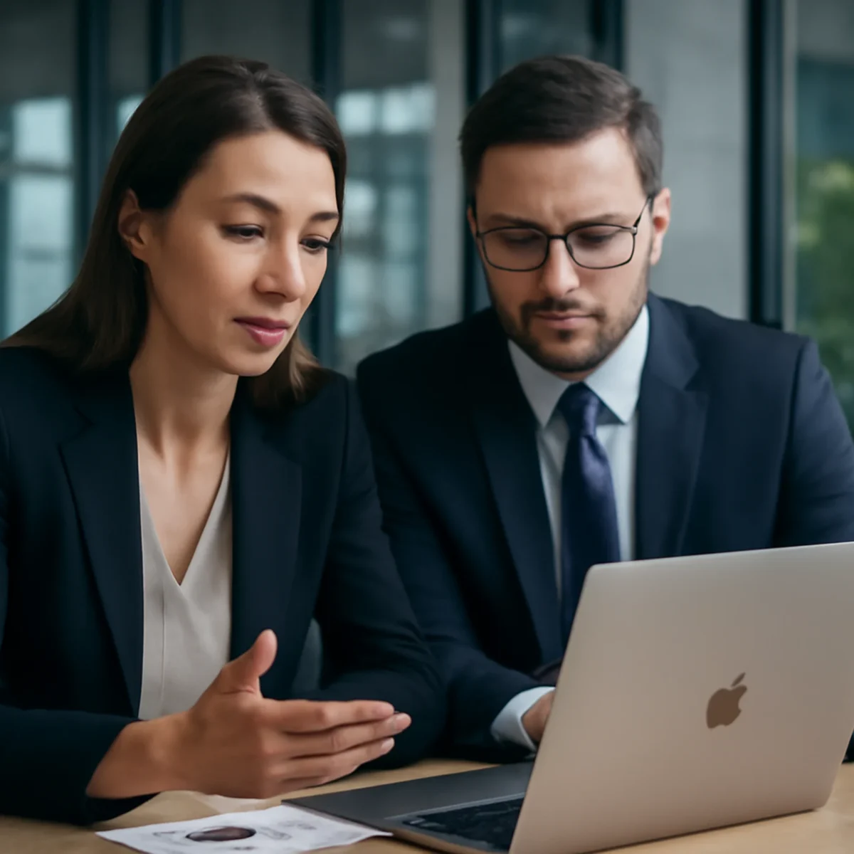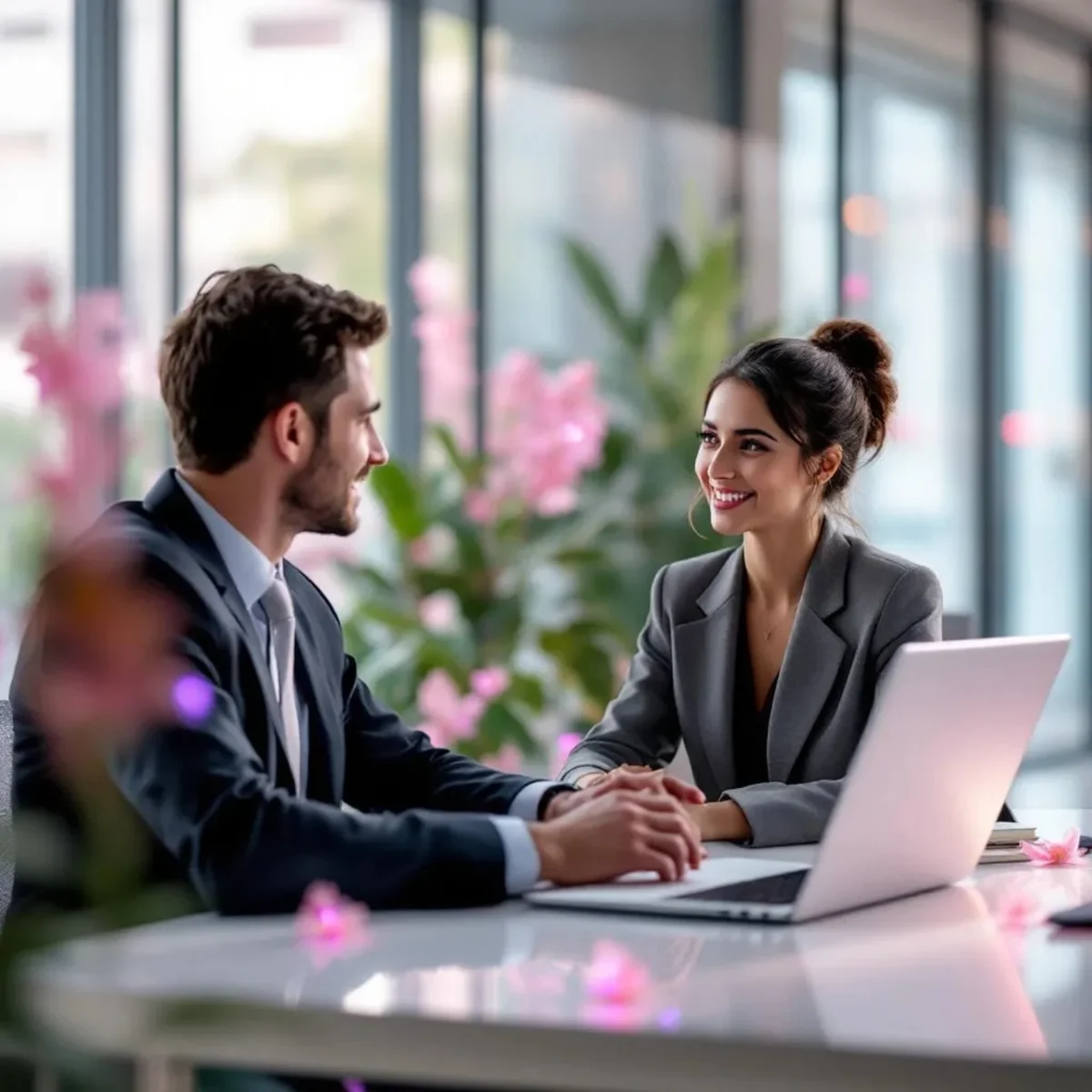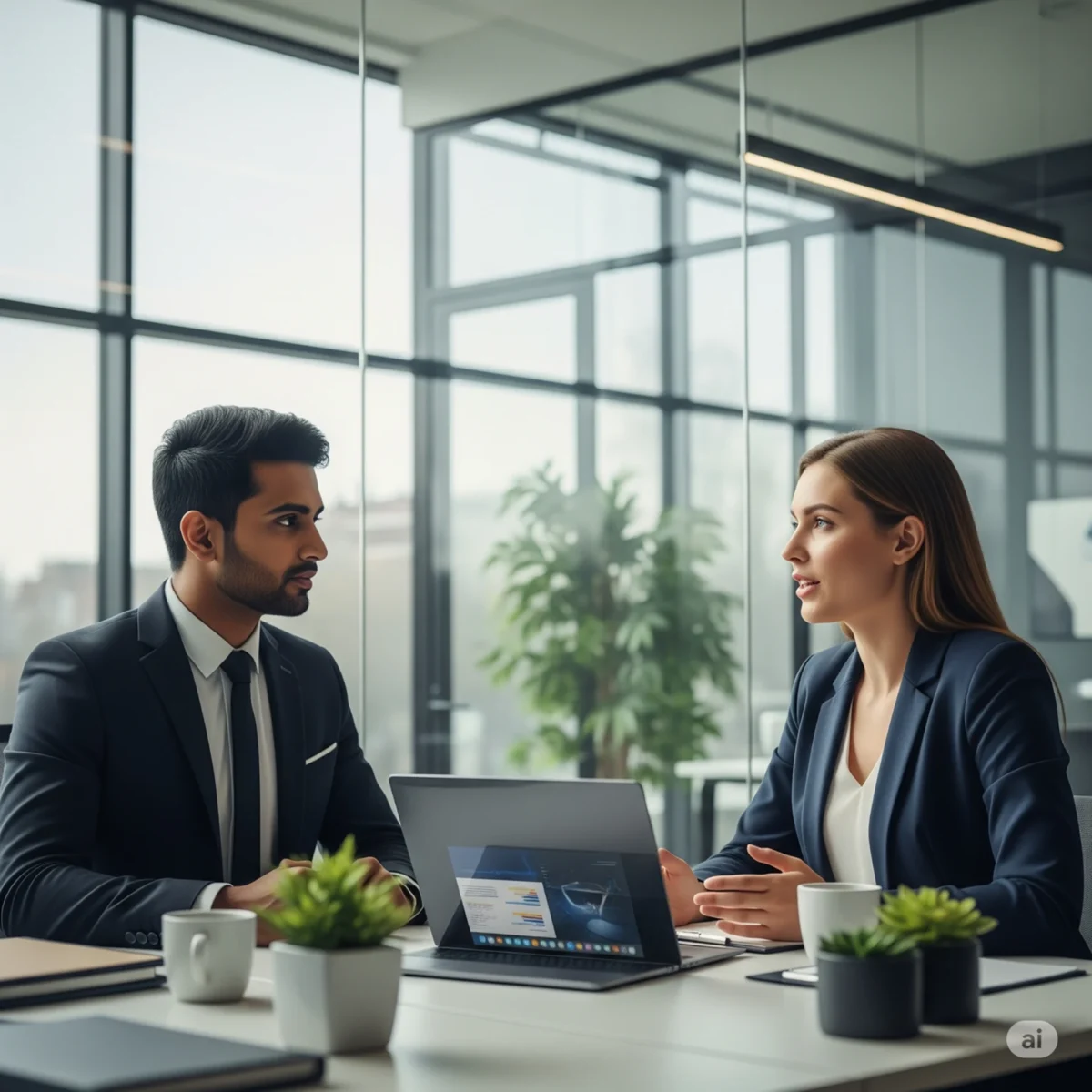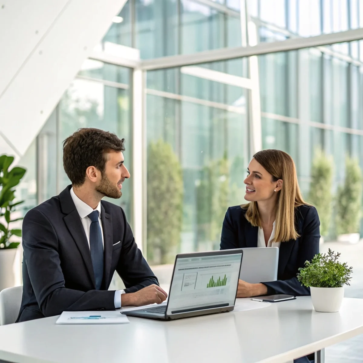 Create a hyperrealistic image of a modern professional office setting. Two professionals, one male and one female, are sitting side by side at a sleek, minimalistic desk. They are both in business attire, the male in a dark suit and tie, and the female in a business blazer. A high-end laptop is open on the desk, displaying a business presentation. The atmosphere is clean and polished, with natural light coming through large windows, highlighting a contemporary, stylish office with glass walls and subtle green plants in the background. Both professionals are engaged in a conversation, with the female speaking and the male listening attentively. The setting should evoke a sense of focus and collaboration.